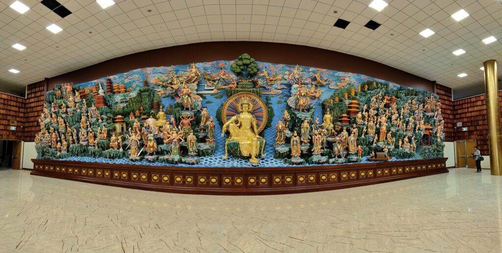 善财宝殿是一个多功能厅,它因为一幅巨幅浮雕而得名。整个五十三参浮雕作品长26.2米(合86英尺),高6.4米 (合21英尺),供奉于五台山大殿一楼多功能厅,是一幅巨型雕工精美的艺术大作。这幅巨雕上面的人物栩栩如生,一共有53位。其中53个人物的立体雕像都是独立的立像,每个人物雕像约1.08米。这里面还有一个非常有趣的故事呢。